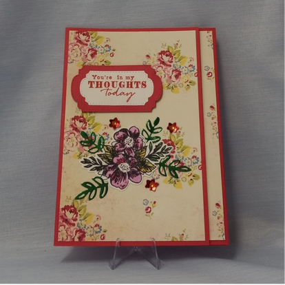 Thinking of You Card - This elegant, handcrafted "Thinking of You" card features a delicate vintage floral background accented by two intricately detailed, layered butterflies. The unique split-panel design is beautifully tied together with a soft pink ribbon, adding a sophisticated, tactile touch to your message. This sophisticated piece is a memorable way to share a heartfelt message.