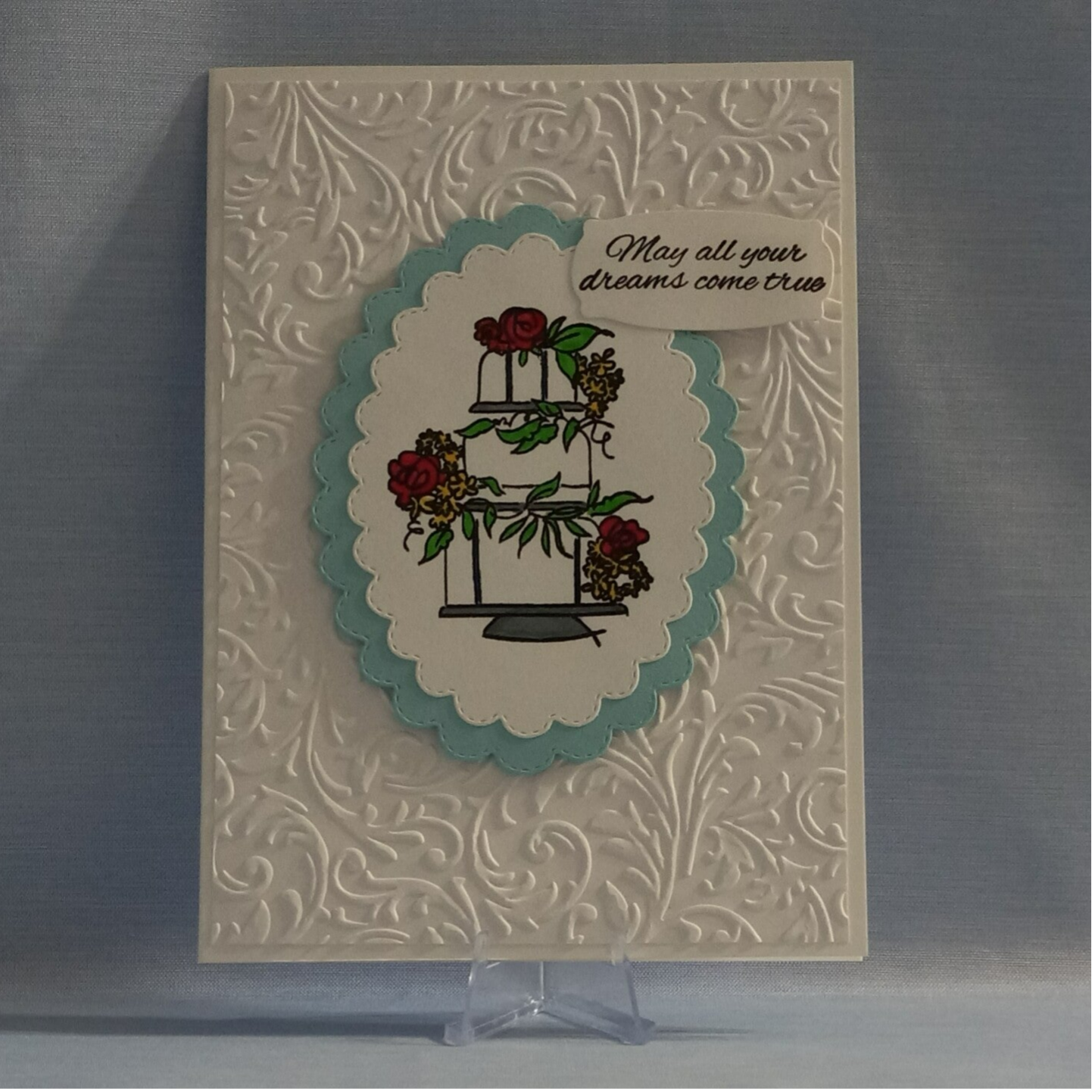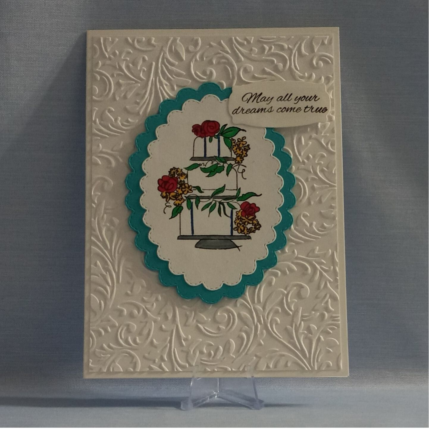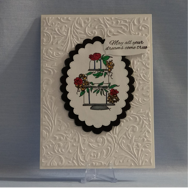 This vintage styled card is a beautiful tribute to the couple's journey—past, present, and future. Featuring a sophisticated wedding cake against an antique background, it is a timeless memento. Extend your warmest wishes to the happy couple for a future filled with happiness and for all their dreams to come true.