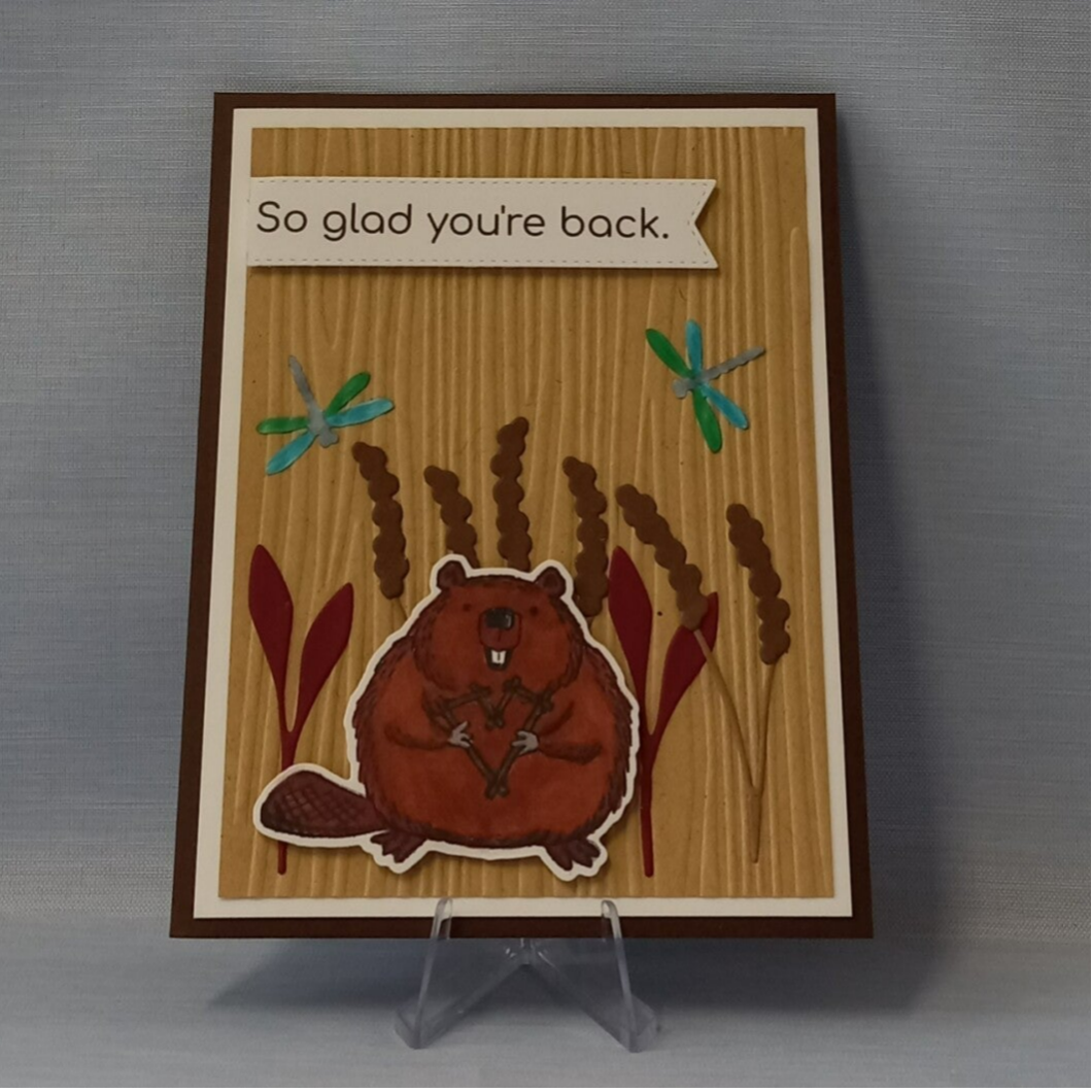 Companies of Supplies Used: Birthday Florals by Sixxiz (Cattails), Fluffiest Friends by Stampin' Up! (Beaver) and Wood Embossing Folder by Creations by Gabby (Background)