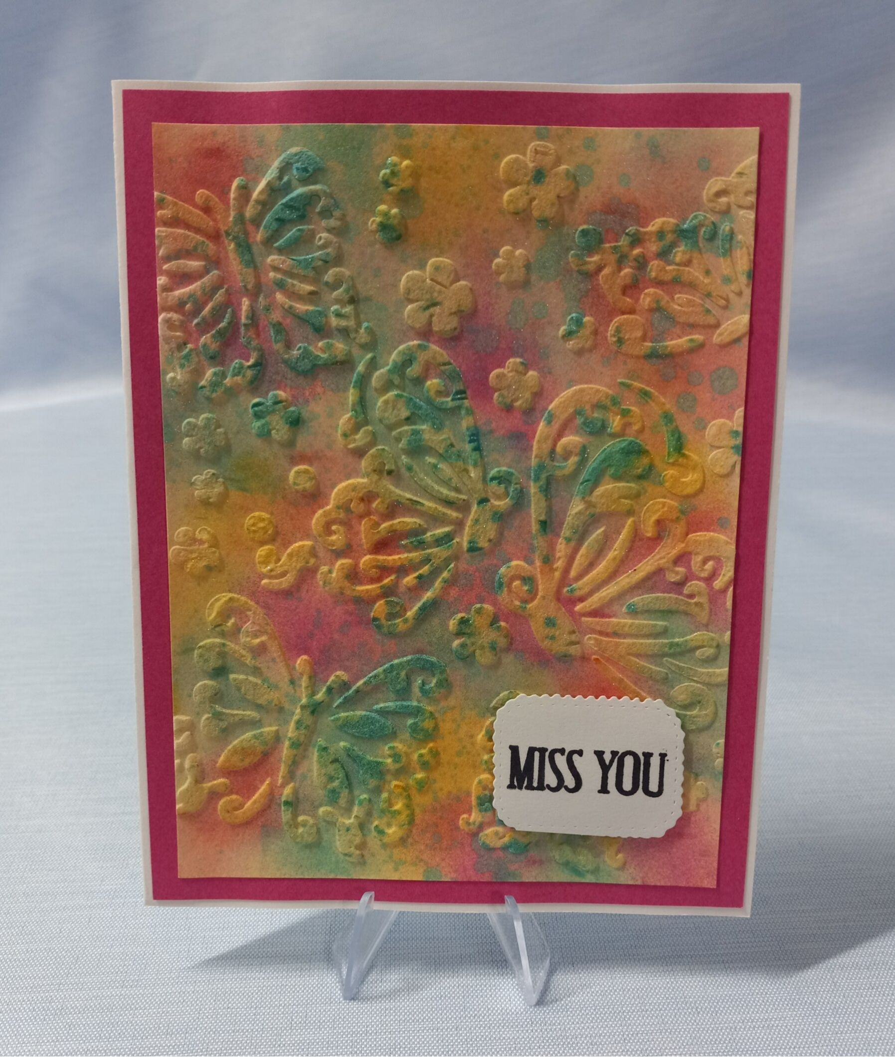 Miss You Card - This card has an inked background. A butterfly image was stenciled with texture paste over the ink, which picked up the color and eliminated the need for a focal point. The sentiment says, 'Miss You'.