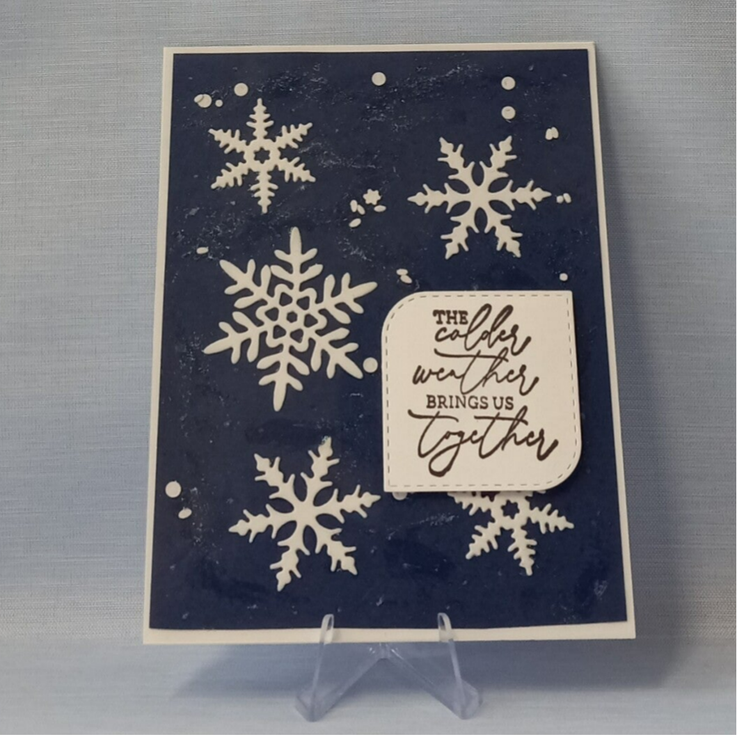 Once you’ve drawn near to someone over the colder months you begin to realize just how close you are to that special someone and you soon want to let them know just how you feel. This card will convey that message to them. With a deep blue background and stark white snowflakes it will give them hope for your future together.