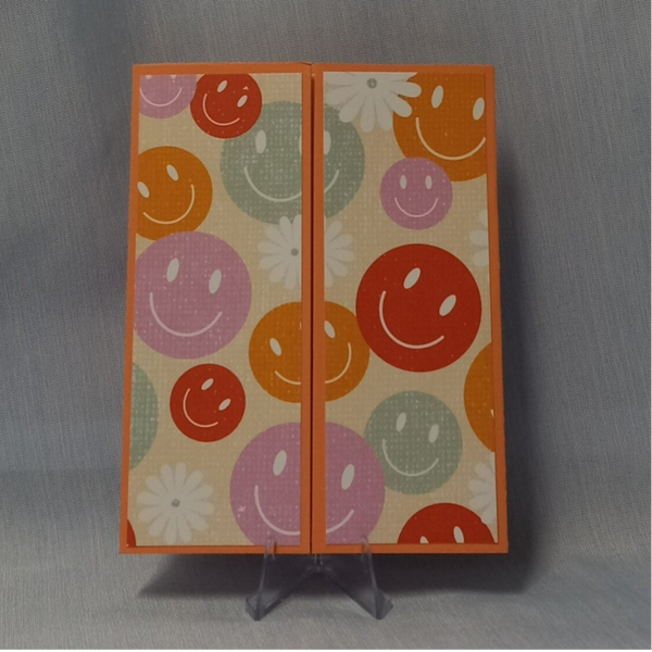 This card has a pastel-colored background with an aperture window. The colors behind it are inked in muted colors. It has three daisies with pink pearls in their centers and three smiley faces. The sentiment reads in a large font, 'Smile'.