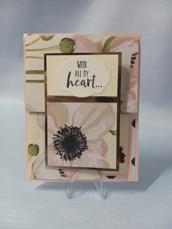 These cards will be sure to delight their receiver. The fold is a bit complicated yet very intriguing. The sentiment starts on the outside, saying, 'With all my heart...', and continues on the inside, saying, 'I thank you for all the kindness in yours.'