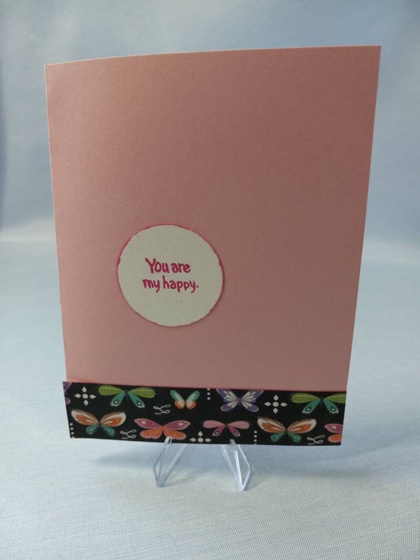 Thinking of You Card - This card has a white speckled background, a cut-out butterfly, and a sentiment that reads, "I get butterflies just thinking of you." Inside, a paper strip is included to match the color, along with an extra sentiment that reads, "You are my Happy."