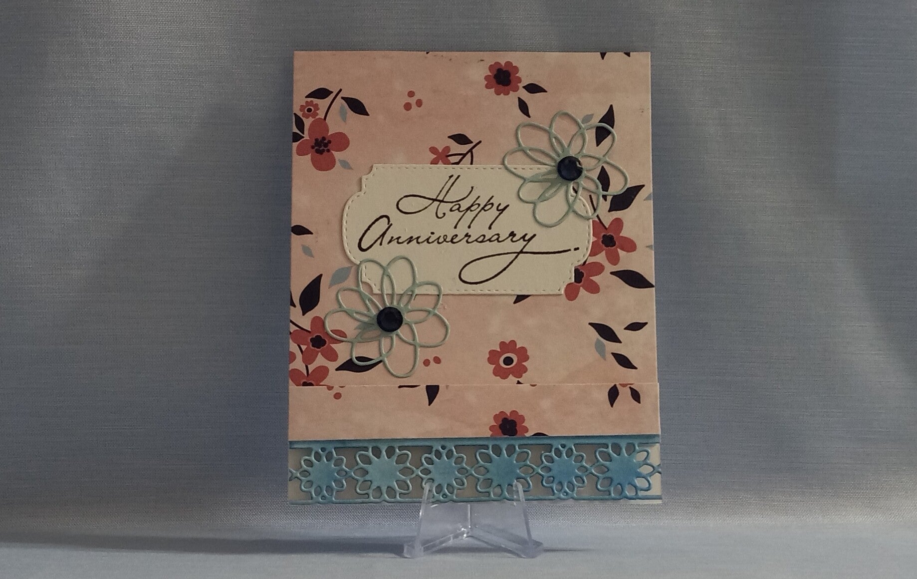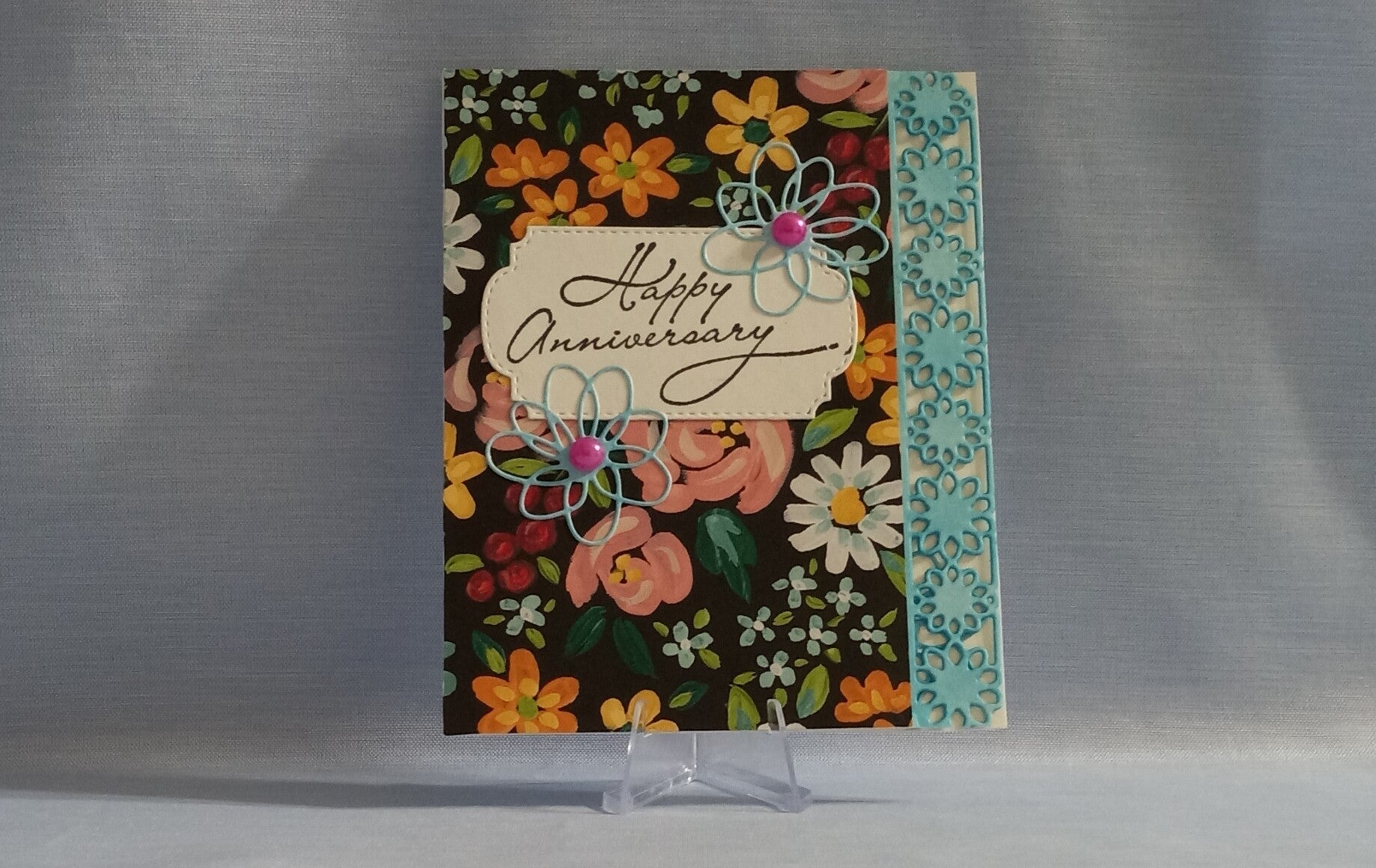 Companies of Supplies Used: Thoughtful Expressions Stamp & Die Set by Stampin' Up! (sentiment label and flowers), DSP by Stampin' Up! (Flowers & Field and Paper Blooms), Happy Anniversary Block Stamp by Inkadinkado
