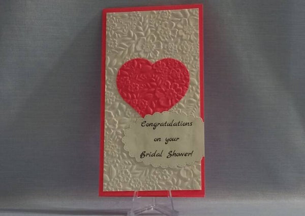 This simple card gets right to the point. The old adage “pretty in pink” fits this card perfectly. It has a embossed heart and embossed background. The sentiment follows suit by remaining simple and saying, “Congratulations on your Bridal Shower!”.