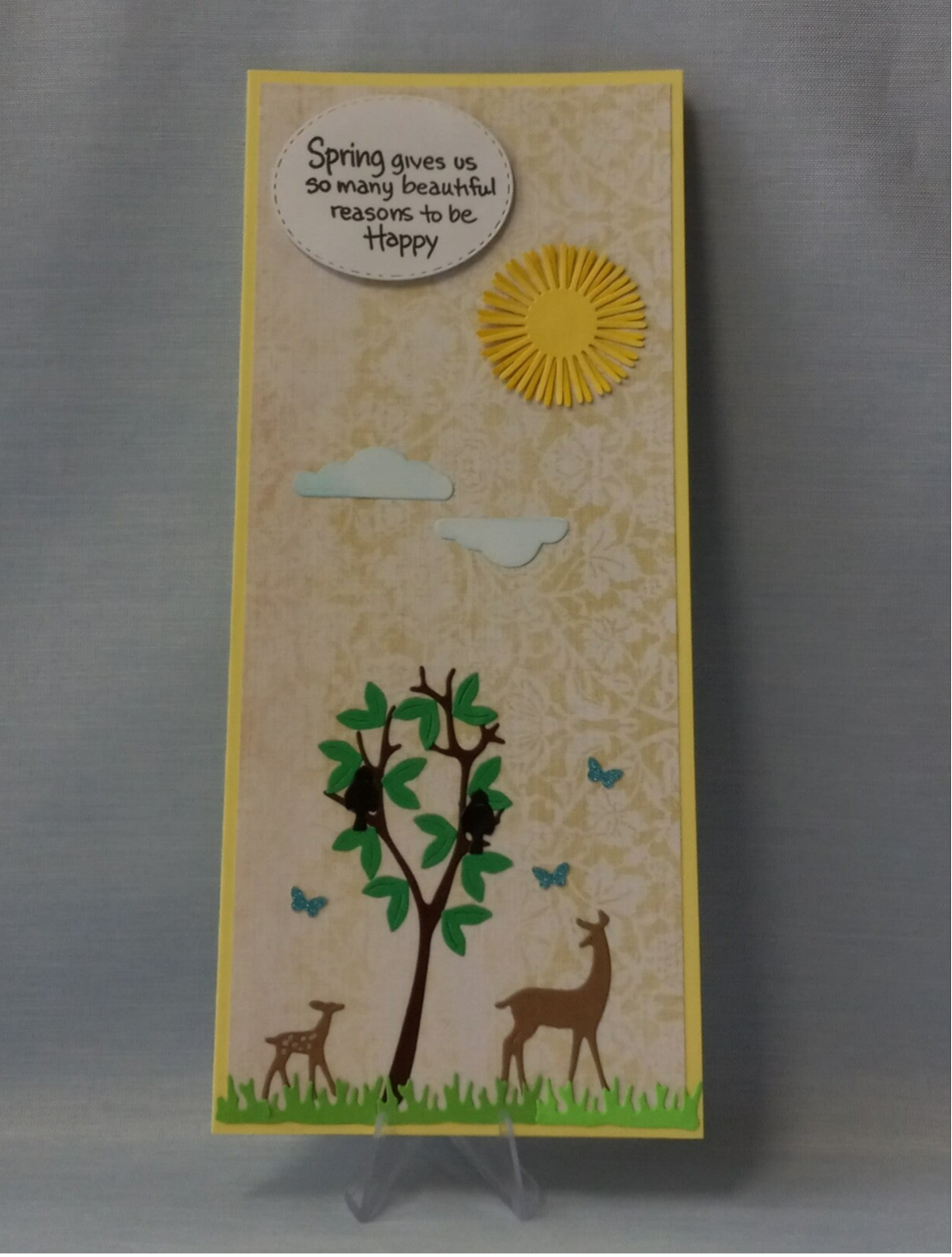 The sentiment on this card is so true. Spring does give us so many reasons to be happy. Perhaps you know someone who is a little down because of the past winter season. A bright, cheerful nature scenic card like this could be just what they need. The inside is blank, giving you plenty of room to write the encouraging words you've longed to tell them.