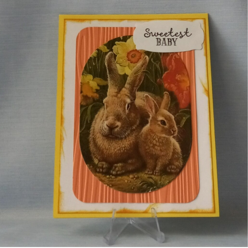 Companies of Supplies Used: Wood Embossing Folder by Creations by Gabby (Background), Woodland Embossing Folder by Stampin' Up! (Background Layer), Wildly Happy Stamps by Stampin' Up! (Sentiments, So tiny so small so loved by all, Wildly Happy and Sweetest Baby), Honeybee Home Stamps by Stampin' Up! (Sentiment, Such Happy News) and Many Messages Stamp and Die Set by Stampin' Up! (Sentiment Labels on Rabbit and Owl Cards)