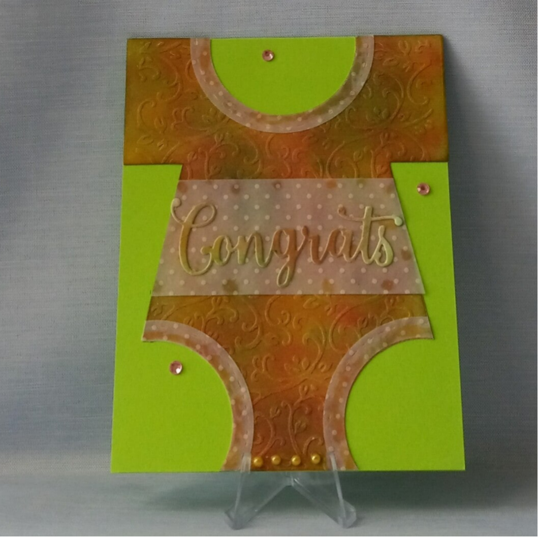 This card features a onesie, which is classic and charming. The onesie is a simple, universally recognized symbol of infancy, new beginnings, and coziness. The new parents are sure to see your thoughts toward their baby as just that... a new beginning and comfort.