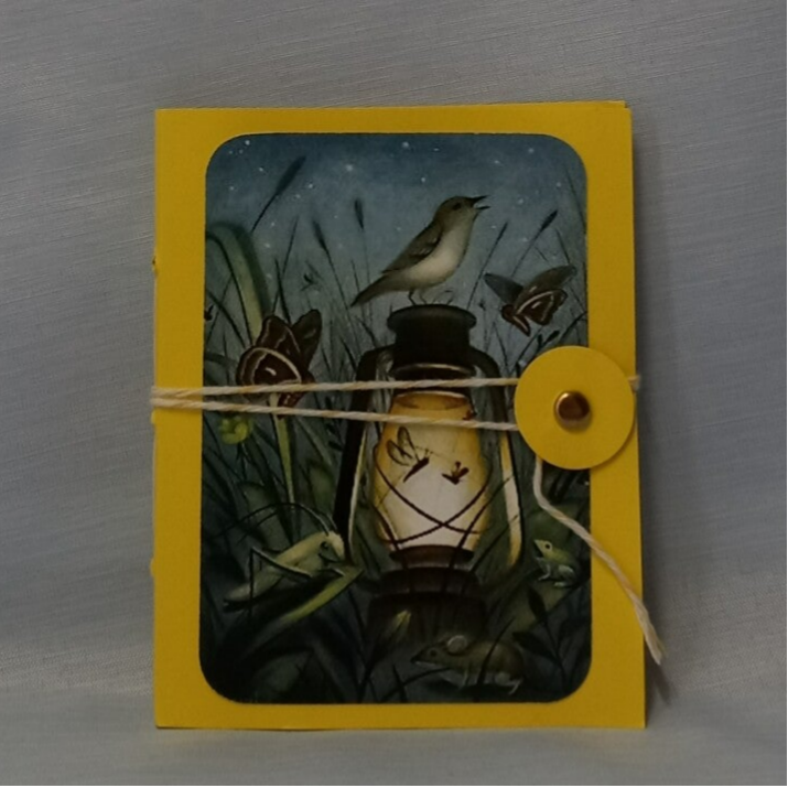 This journal is lovingly assembled with one carefully stitched signature, blending creativity with charm. It’s perfect for light journaling, memory keeping, list-making, creative writing, or simply enjoying it as a small art journal. The yellow cover features night creatures near a dimly lit lantern.