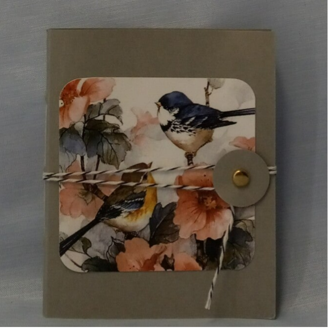 This unique journal encourages consistency. Always by your side, it serves as a constant reminder to fill the pages with whatever you desire. This delightful, hand-tailored miniature notebook is a true one-of-a-kind gem. It features a soft gray cover with an image of two small birds basking in the beauty of a flowering tree.