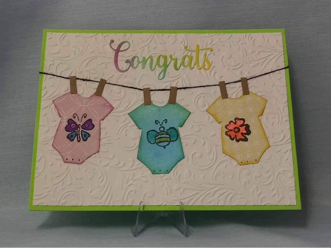This charming handmade baby card features three colorful onesies hanging from a "clothesline" against a beautifully embossed floral background. Vibrant shades of pink, teal, and yellow pop against a lime green border, topped with a sweet glittery "Congrats" message. It’s the perfect, high-quality keepsake to celebrate a new arrival with style.