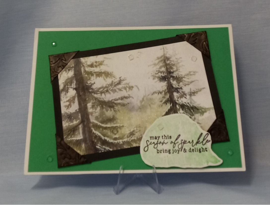 This serene winter-themed card features a misty, faux hand-painted forest scene framed by elegant dark bronze corner accents. Set against a crisp green border, the design is completed with a graceful "Season of Sparkle" sentiment tag. It’s a sophisticated and nature-inspired choice for sending heartfelt wishes.