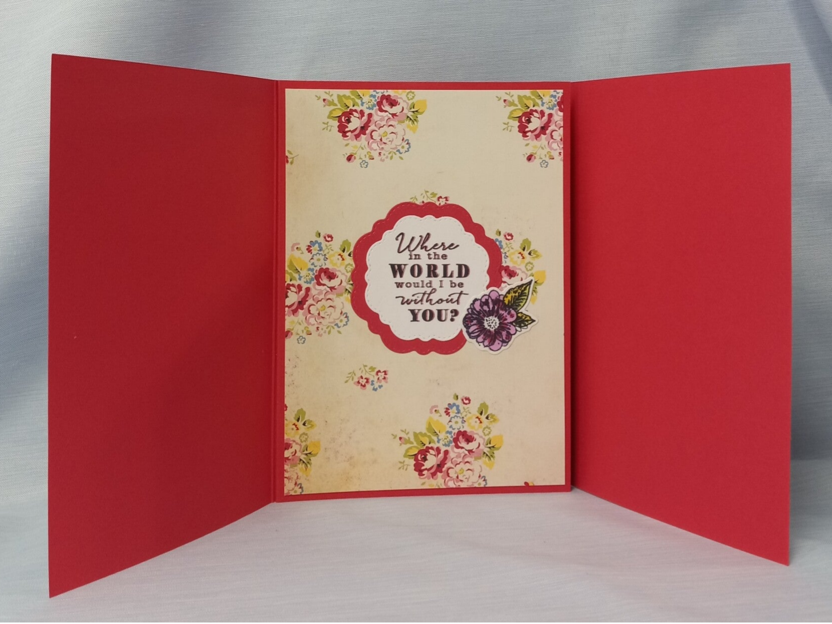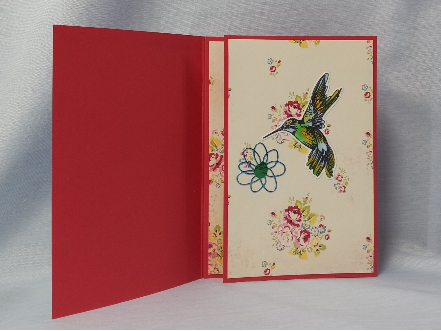 This exquisite, multi-layered trifold card begins with a sophisticated floral exterior that opens to reveal a stunning hummingbird in mid-flight, creating a memorable surprise from the moment it’s received. The interior continues the journey with a sentimental message, all accented by shimmering flowers and delicate vintage motifs. Framed in bold, vibrant red, this high-quality keepsake offers ample space for a personalized note, ensuring your heartfelt message is presented with the elegance and artistry it deserves.